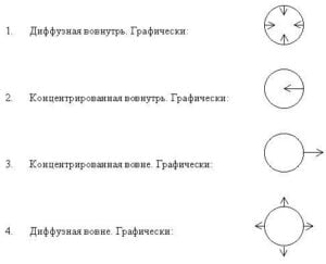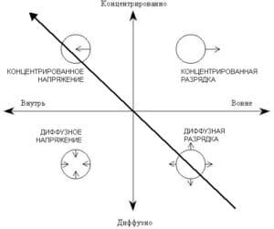 Любой жизненный процесс есть процесс энергетического взаимодействия. Наиболее общие характеристики энергии — её интенсивность и направление. Когда объем энергии задан, интенсивность регулируется формой — концентрацией или диффузией. Направление может быть внешним или внутренним. Таким образом, мы имеем 4 основные вида энергии: